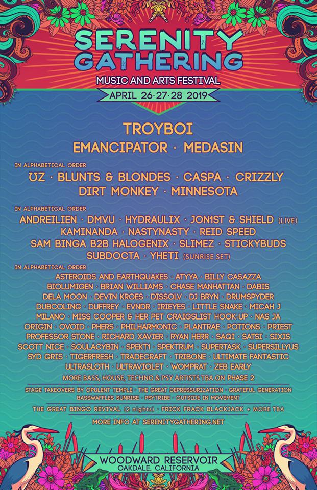Now getting ready for their sixth event, the Serenity Gathering Art and Music Festival announced the first wave of lineup announcements for 2019. The festival will be located at the Woodward Reservoir in Oakdale, California from April 26th to 28th, and there is a broad range of musical artists set to perform. Headlining the event will be UK producers Troyboi and Caspa, electronic producer Emancipator, as well as renowned producer Medasin.